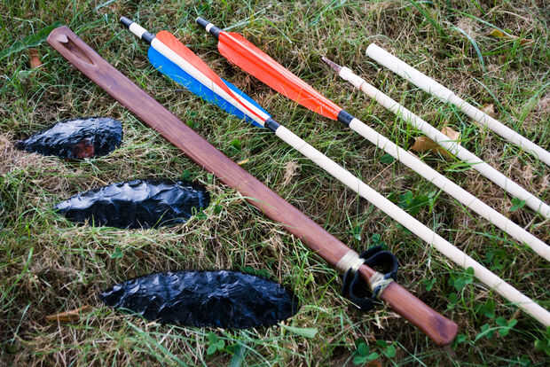 Vamos a construir este atlatl, así como en un video. Cuando el dardo, lo fletch con cinta adhesiva aquí y con plumas en el video.