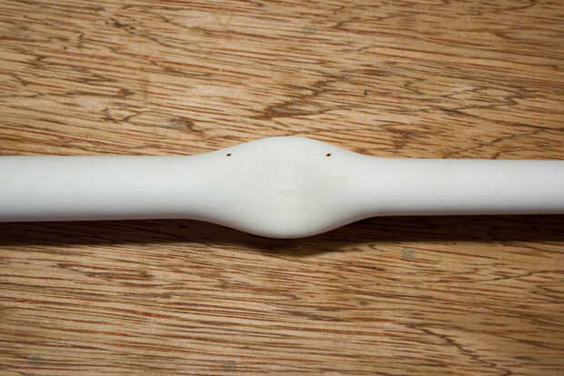 A continuación calentar la sección de una pulgada entre las dos marcas hasta que esté lo suficientemente suave como para presionar. Dos pedazos de tubo de 1/2 pulgada chatarra hacen una buena forma para presionar la manija. Debería ser alrededor de 1/2 una pulgada de ancho entre los surcos.