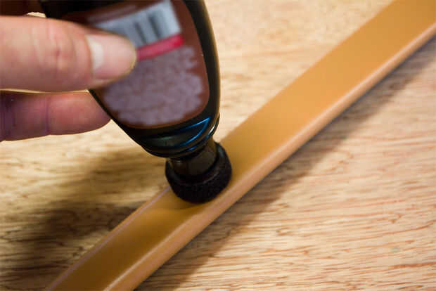 Una vez que la pintura esté seca al tacto pero aún no curado, aplique una capa de betún marrón. Trabajo muy ligero, con varias pasadas. Comenzará buscando acuosa y entreverado con algunas burbujas. A medida que continúe pasar el aplicador de esponja sobre el atlatl, el polaco empieza a curar y gana algún órgano. Una vez que estés feliz con la apariencia del grano, calor el tubo a temperatura baja o con un secador para fijar el esmalte.