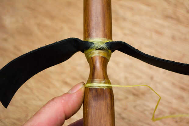 Una vez que los lazos son el tamaño que desee, utilice el mismo abrigo para atarlos en su lugar. Ahora el atlatl es terminado y listo para lanzar. Ahora es tiempo para trabajar en el dardo.