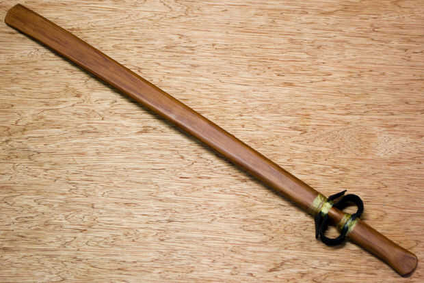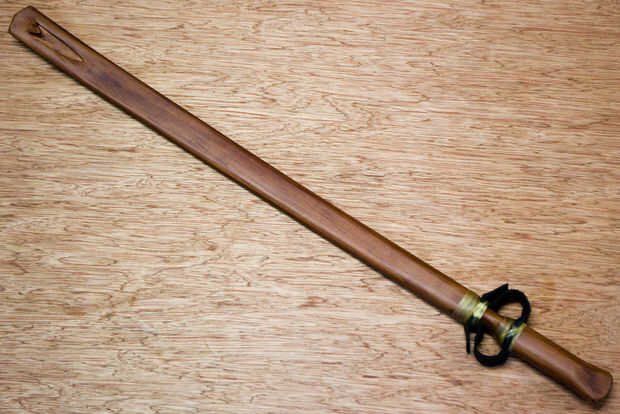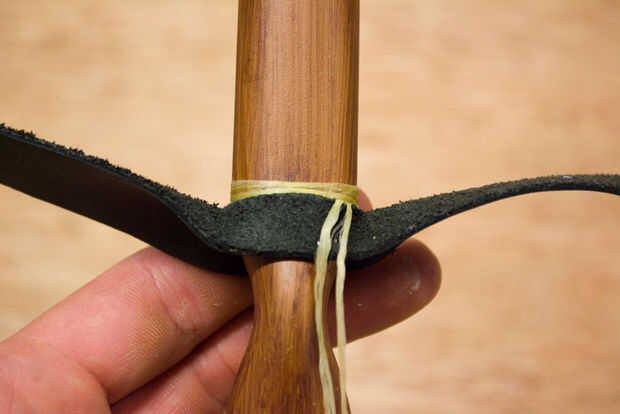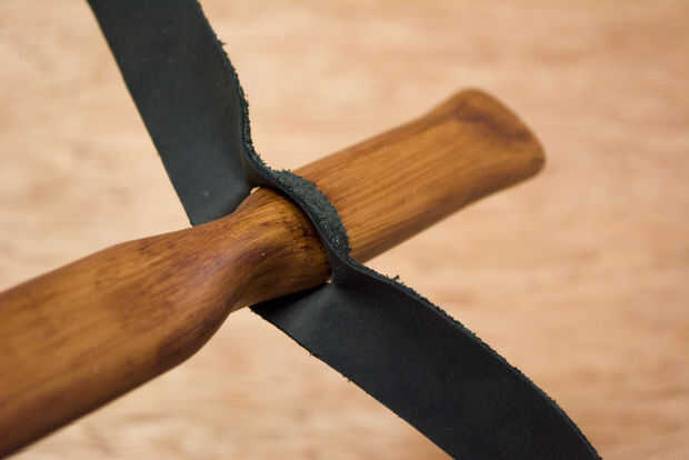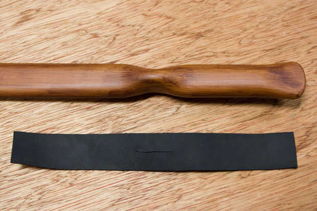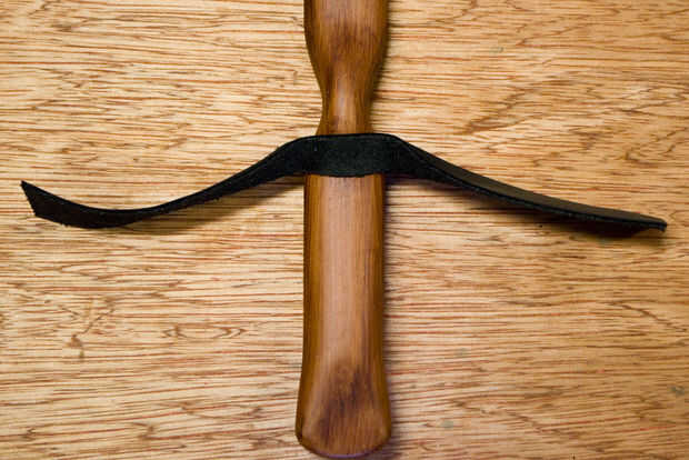 Corte una pulgada de largo de la raja en el centro de la tira de cuero. Deslice la tira de cuero sobre el asa y justo debajo del surco del dedo. Si el cuero que está utilizando tiene un lado liso, debe poner en el interior de los bucles ya que es más suave en los dedos.