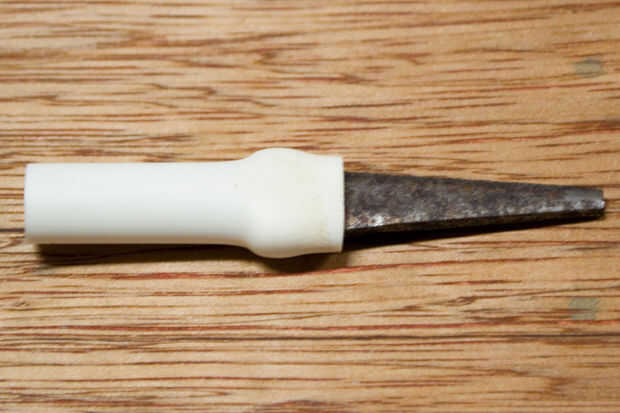 Como el tubo se enfría, mira abajo el dardo y enderezarla. Puede corregir cualquier distorsión ligera alineando solo el dardo a través del conector. Una vez que los enfría de tubería será difícil retirar el conector de primera vez, así que separe el dardo mientras esté todavía ligeramente caliente. El extremo del dardo de la arena hasta que el conector encaje bien pero viene aparte fácilmente. El dardo está terminado!