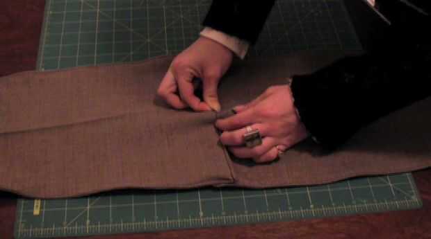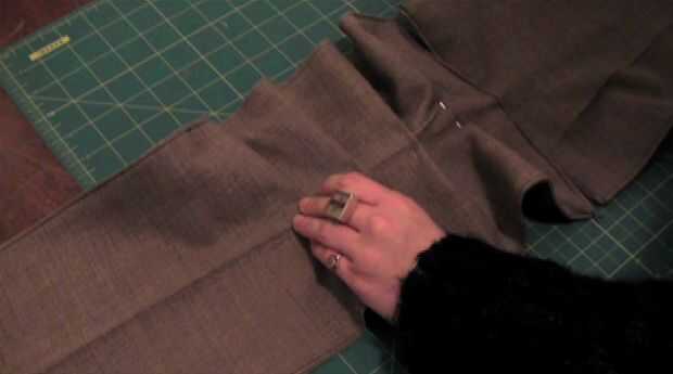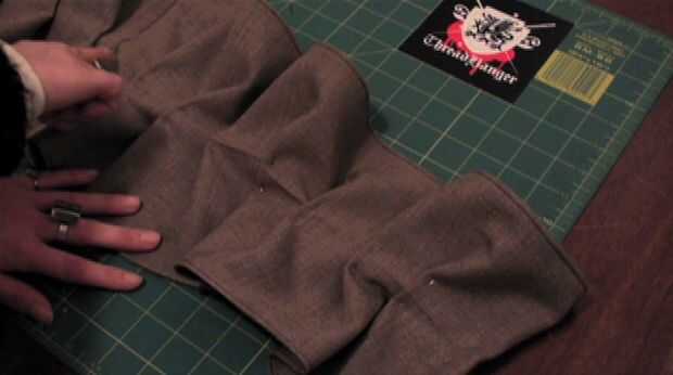 4. ligeramente se superponen los dos extremos más ancho y pin. Ahora hacer pequeños pliegues hacia abajo de un lado y pin. Repita en el otro lado, asegurándose de que ambos lados debajo del doblez.