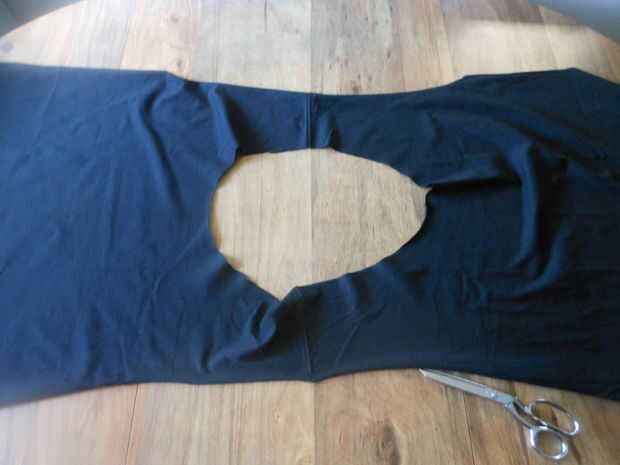 Para tratar, pegar un brazo a través del orificio del cuello y el otro brazo a través del mismo orificio del cuello. Una de las costuras de los hombros será a lo largo de la parte posterior de su cuello y la costura del hombro va a ser el centro de la espalda. Esto es donde usted determinará si necesita eliminar más material del agujero del cuello, para que se ajuste cómodamente.
