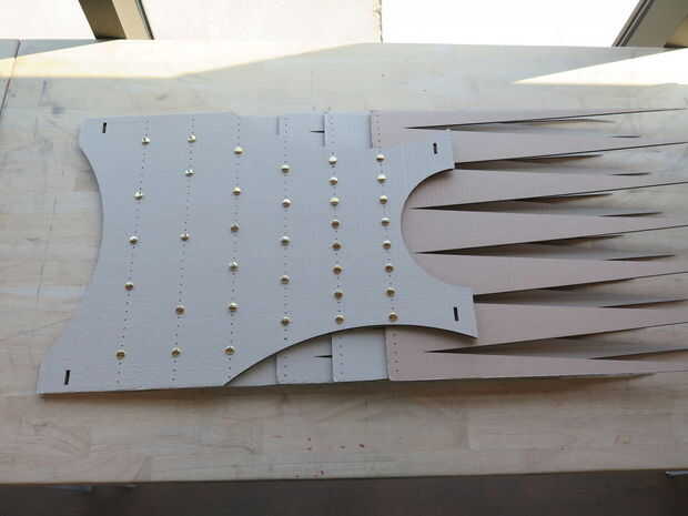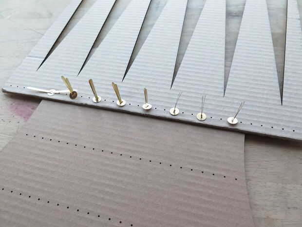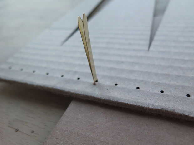 Centro de una fila de púas a lo largo de la línea superior de orificios en el panel posterior. Viene de abajo, levante un sujetador de latón a través de los agujeros de la pared posterior y la fila de spike. Repetir este proceso para los orificios restantes en la fila que desea utilizar.