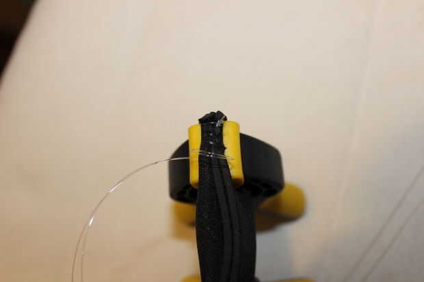 En este punto recordé donde colocar la línea de pesca de monofilamento de 10 libras prueba y conectado a él para la costura. También pensé que sería más fácil usar una abrazadera pequeña carpintería para sostener el neopreno. Primera creación fue totalmente a mano, y me parece recordar que conseguir un calambre en mi palma de sostener firmemente el neopreno durante actividades de costura.