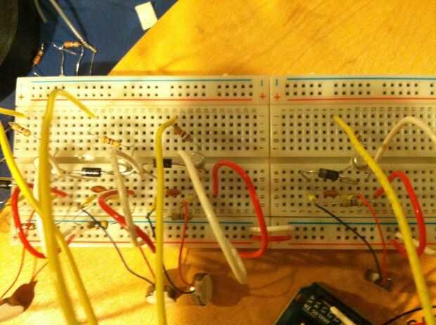 Estoy bastante seguro de que usted podría conseguir lejos con el uso de un diodo/condensador si usted engancha encima de la derecha, pero esto facilita el cableado y son realmente baratos de todos modos. No te olvides de probarlas de los motores. Ya que están en paralelo, una falta no hará todo dejar de trabajar, que hace muy fácil solución de problemas. Enchufe de ellos todos en y solo suman 7 pernos más el código de ejemplo del paso anterior. Para cada uno usted necesita para definirlo, establecer el modo de salida y Dile a activar y desactivar: