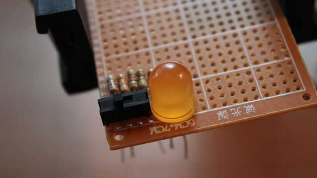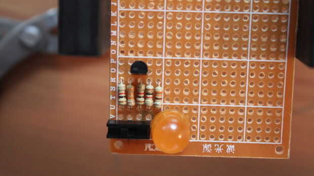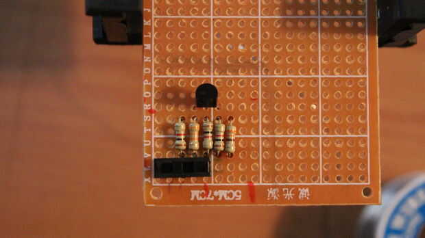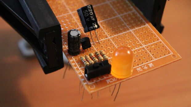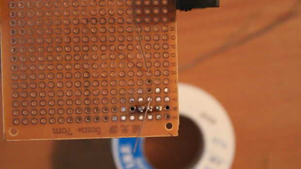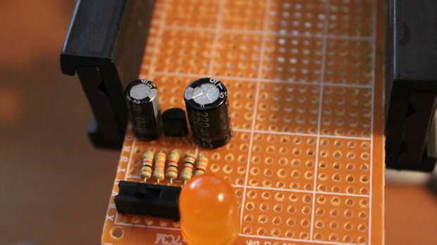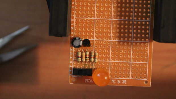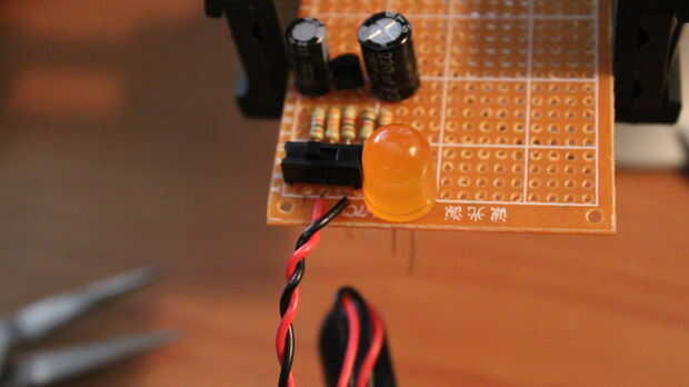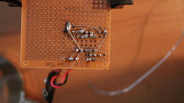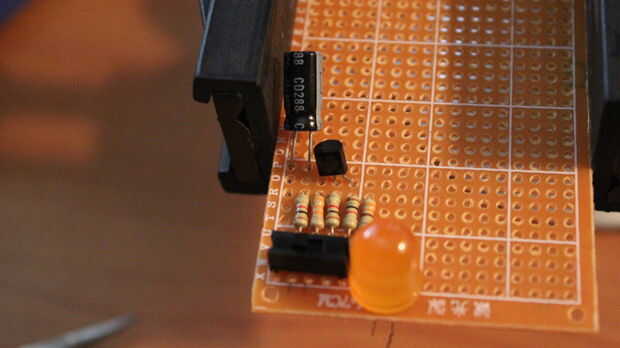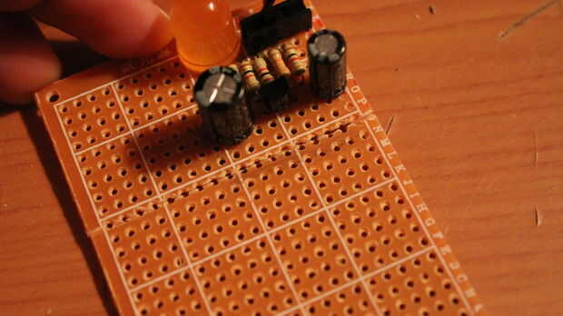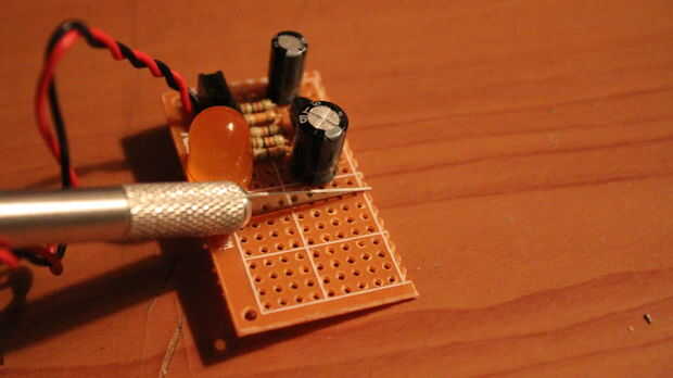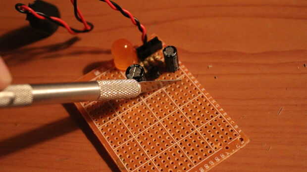 - La resistencia más cercana al interruptor, 1k, va soldada al positivo del condensador de 100uF. Lo hice por el liderazgo de la resistencia de flexión en la dirección correcta en el lado de la cabeza del condensador. Cuando la articulación se hizo corte apagado el exceso y poner en un plato pequeño de plástico. Generalmente estos guardar porque vienen prácticos para hacer las conexiones sin cables.