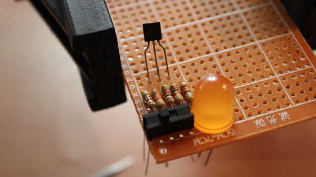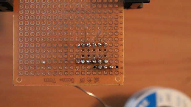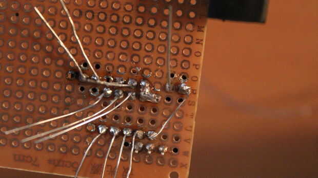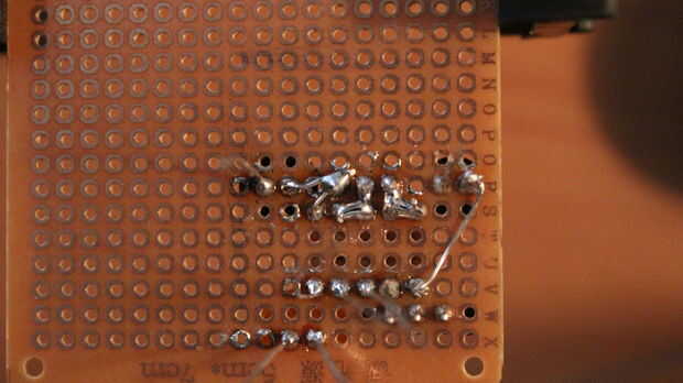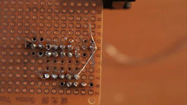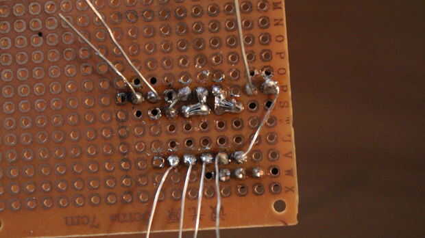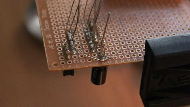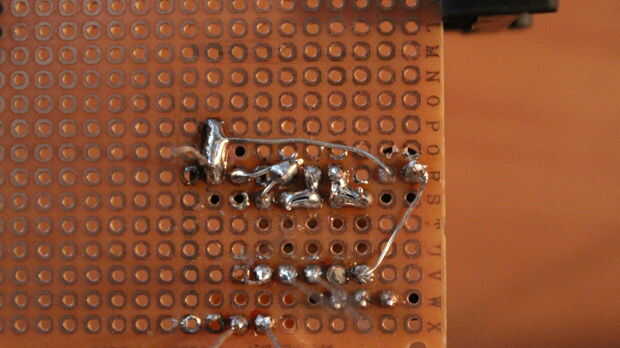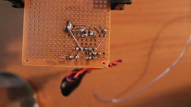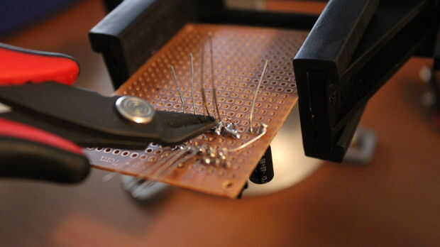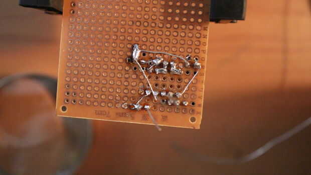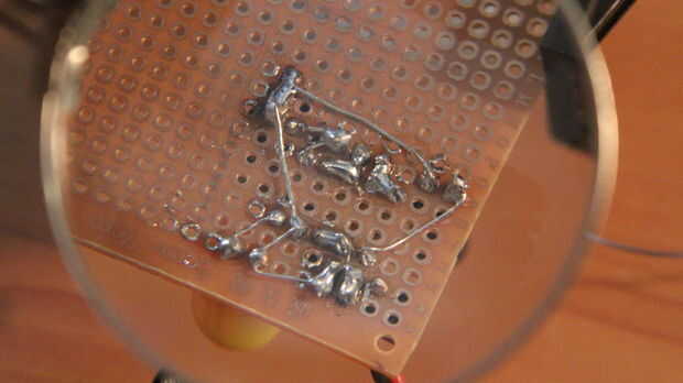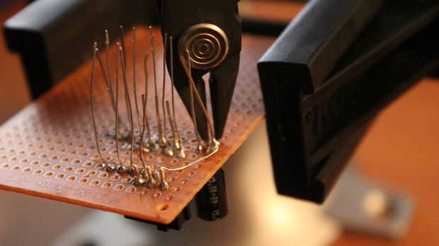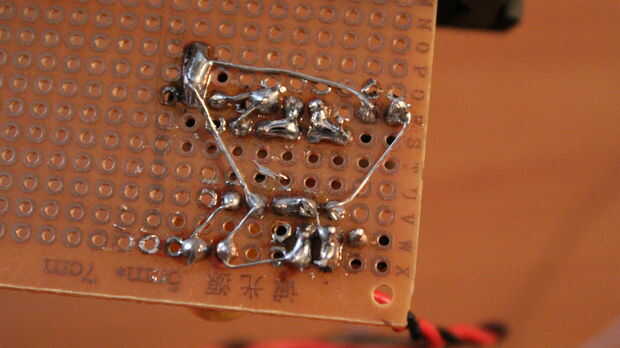 - Doble todos los cables fuera del camino por lo que puedo tener una visión clara de mis articulaciones. Esto es donde la soldadura de puentes que conectan más de un componente. La articulación en forma de L conecta la derivación del transistor, más cercano al condensador de 100uF, la resistencias de 1k y 33 k. La siguiente es otra forma de L pero hacia atrás el conectar el centro conducir del transistor a las resistencias 1 de k en el medio. Puesto que las dos conexiones se realizan recorta los conductores para ellos. La última iniciativa para el transistor va a la última resistencia de 330 ohmios.