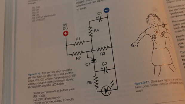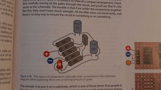 Lo primero es lo primero, he incluido el circuito del libro que recomiendo para la electrónica. al lado de es el diagrama del circuito para aquellos que no saben leer esquemas. Estos fueron muy útiles, especialmente cuando yo estaba empezando. No son tan intimidantes ahora que tengo más experiencia. Con el circuito esquemático y el diagrama podemos planear hacia fuera el diseño en el tablero para saber qué va dónde. Coloqué los componentes en posición cerca del borde por lo que es más fácil cortar más tarde. De esta forma que puedo visualizar cómo se conectan en la parte trasera cuando yo les de la soldadura. Luego tomo una foto para referencia más tarde.