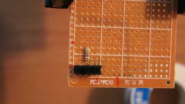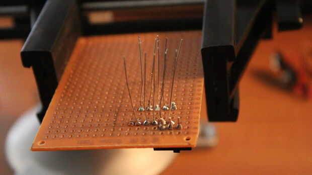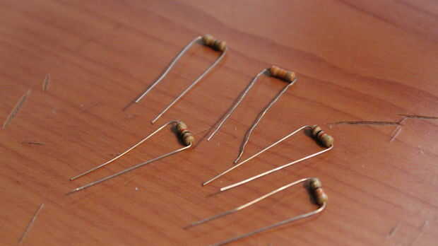- Después de la soldadura de las resistencias. colocarlos en curva entonces la lleva hacia fuera para evitar que se caigan. Ajuste la resistencia de calentar la soldadura y la resistencia a ras a la Junta. Repita el proceso para el resto de las resistencias en este orden: 1k, 33 k, 1k, 1k y 330 ohm. No enganche los cables todavía. Algunos se utilizará para las conexiones.