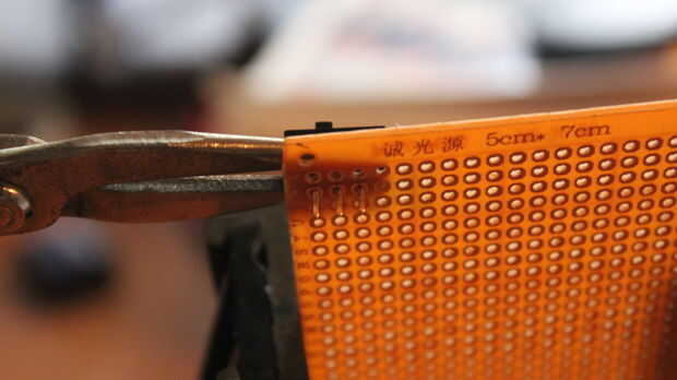 - Comencé por soldar el interruptor situado en la orilla recordando a saltar un agujero para los cables de la batería de 9v. La soldadura debería verse como volcanes brillantes. Otra cosa que eso y posiblemente es un empalme frío, lo que significa que no está conectado eléctricamente. Tocar la plancha para el plomo a calentar y añade la soldadura.