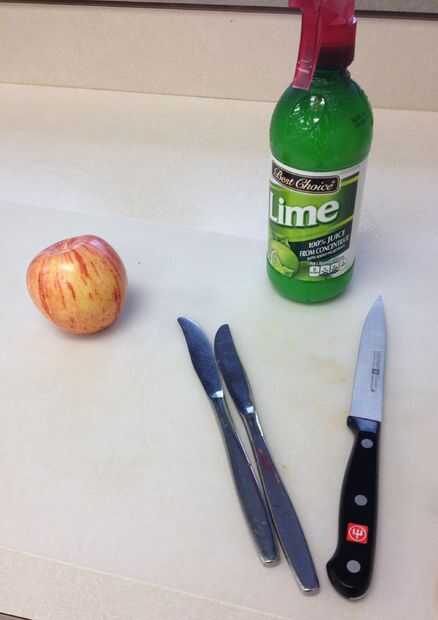 Una bonita manzana brillante en tamaño proporcional alrededor de todo el camino. Cuchillos de mantequilla dos del mismo tamaño exacto. Algunos jugo de limón para evitar que la manzana oxidantes antes de ensamblar, un cuchillo de cocina, una tabla de cortar y una placa de calentón para la foto final del cisne de manzana completa.