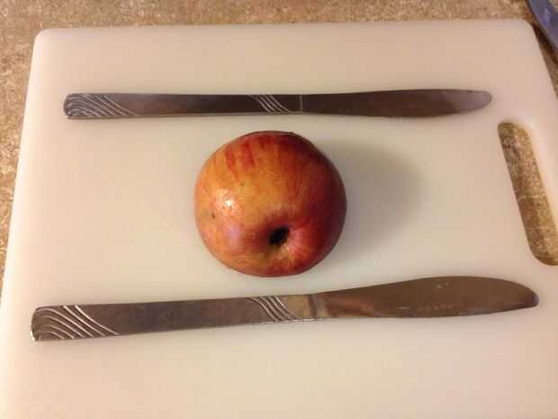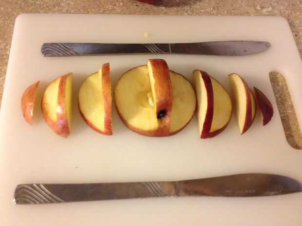 Tomar más de la mitad de la manzana y poner cara abajo en la tabla de cortar. Coloque cada cuchillo de mantequilla en los lados de la manzana como se ve en la foto. Esto permitirá cortes y uniformidad a lo largo de las alas.