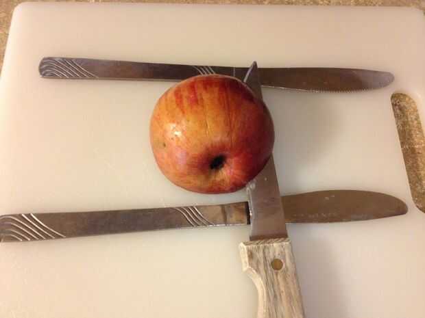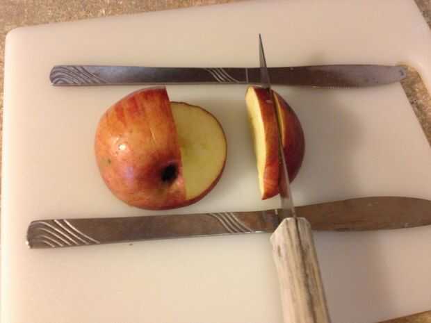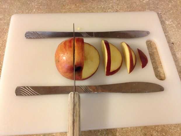 Coloque el cuchillo ligeramente a la derecha de la base y corte cuidadosamente hacia abajo hasta que el cuchillo de cocina de toque los cuchillos de mantequilla. Corte otra vez por el lugar el cuchillo de cocina encima de los cuchillos de mantequilla y cortar la manzana hasta que cruza con el otro corte previamente.