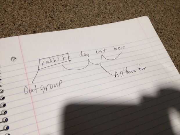 ¿Qué hace tus organismos diferentes entre sí? Piensa en rasgos físicos o fisiológicos en la naturaleza que son únicos a ese orden o familia de organismos. En nuestro ejemplo, podríamos utilizar el consumo de carne para separar nuestro oso, perro y gato de nuestro conejo. Esto hace el conejo el outgroup.