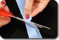 Después de que ha envuelto su último lazo, aplanar y sujete con fuerza el centro de todos los lazos. Corte una muesca en forma de triángulo en el centro de un lado de la cinta que va un poco menos de la mitad a lo ancho de cintas. Repita en el otro lado, ser cuidadoso corte completamente a través de la cinta. Ahora debe tener una acentuada forma de reloj de arena en el centro de los bucles.