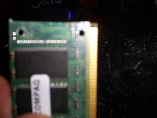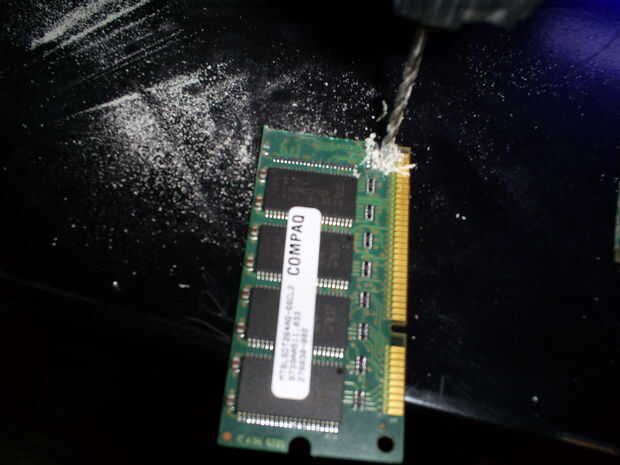 OK ahora es el momento de romper la broca, tome y haga dos orificios en el extremo de cada trozo de memoria ram (ver foto). Trate de asegurarse de que la línea es ok si no lo hacen, pero funciona mejor si lo hacen.