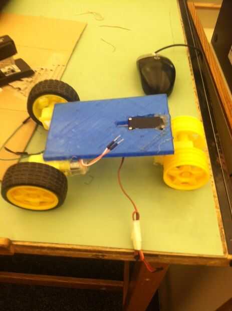 En primer lugar, tomar sus motores de corriente continua de 2-4 y dos cables de puente a cada conductor de cobre de la soldadura. Tomar lo que sea que usted está usando para la base y corta un agujero en él que sea lo suficientemente grande como para caber su servo en. Pegamento caliente el servo en su sitio. Luego, tomar el eje y pegamento caliente para su servo. Esto actuará como su dirección. Tienen los cables de los servos vienen de debajo de la base. Después de eso, pegue el otro eje en el otro lado de su base, también en la parte inferior.