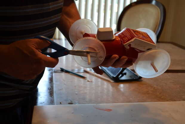 Deslice las tapas de bebida grande a cada lado de los ejes traseros y encolar en su lugar. Recorte todo el material de paja.