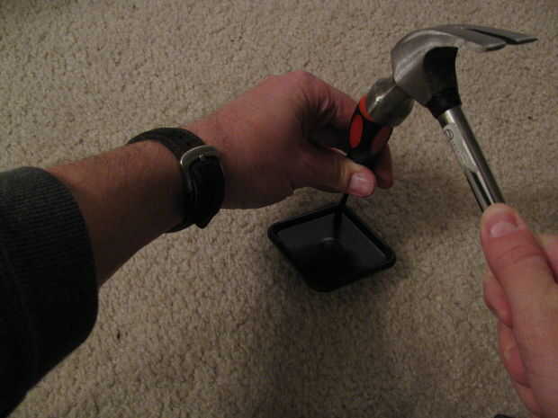 La taza de rueda será utilizada como la parte posterior de nuestro muelle ya que tiene un lado de tela que le ayudará a proteger nuestro dispositivo. También será el "hub" para nuestro alambre. Para enhebrar el alambre a través de la taza de rueda, necesitamos unos agujeros. Las tazas de ruedas que utiliza tienen un forro de aluminio que funciona muy bien para perforar agujeros a través sin agrietarse nada. Acabo de utilizar un destornillador como un golpe y martillado en 6 agujeros: 2 a la izquierda, 2 a la derecha y 2 en la parte inferior.