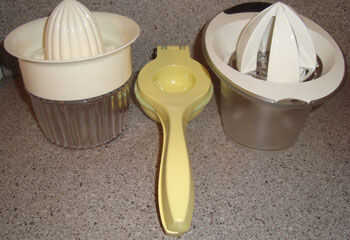 En exprimidores de limón, a veces llamado exprimidores: hay varios tipos disponibles. Mi favorito puede ser el OXO (a la derecha en la foto) ya que puede manejar frutos de varios tamaños, y jugo de todo tipo de cosas. También me encanta el estilo de la palanca uno en el medio ya que es rápido y fácil para pequeñas frutas como limones y limas. Por cualquier razón, comúnmente utilizo el baratito en la izquierda. Todos trabajan; es preferencia personal.