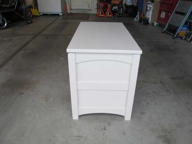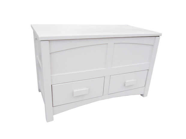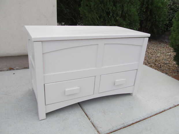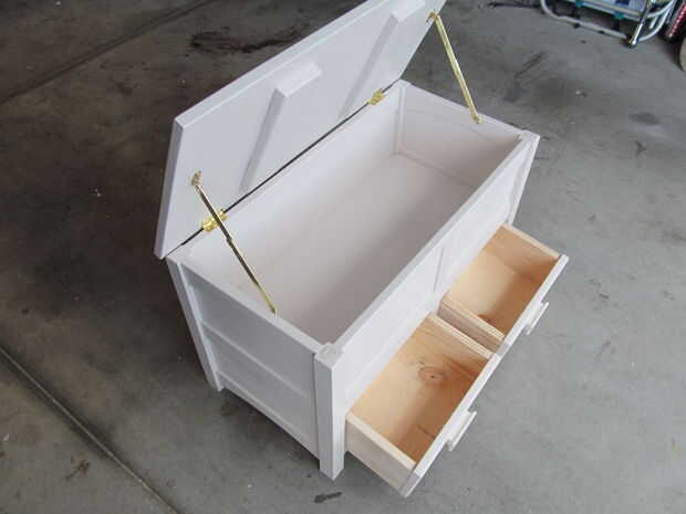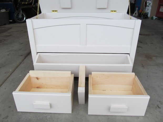 Ha hecho de pino selecto y pintado el color "Arena de la playa". Cuando se quitan los cajones, tirando el montante de centro revela un compartimiento secreto.