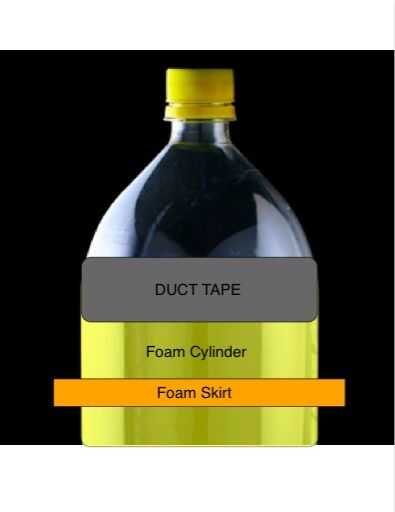 La creación de la parte superior de su cohete es muy sencillo. Todo lo que tienes que hacer es tomar la parte superior de la primera botella de cortar y adjuntarlo a un cilindro de espuma con cinta para tubos. Luego tome un pedazo de espuma y colóquelo debajo de la tapa de la botella. Seguimiento de la parte exterior del círculo en la espuma. Corte el círculo con el cuchillo del Exacto. Usar el exterior como una falda y colocar alrededor del cilindro, fijar con una grapadora.
