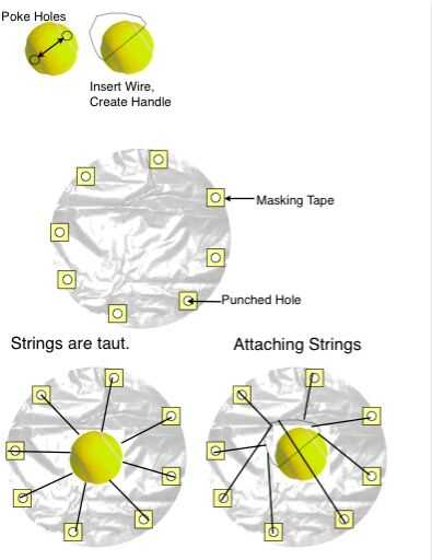 Con el cuchillo del Exacto, corte un agujero en la pelota de tenis. Tomar un trozo de alambre y lazo a través de la pelota de tenis, por lo que crea un identificador. Entonces toma el paracaídas y ponen 8 pedazos de cinta adhesiva, repartido uniformemente alrededor del borde. Luego perfore 8 agujeros, uno en cada trozo de cinta adhesiva. Su línea de pesca y cortar piezas de hasta 8. Atar un extremo de la línea de pesca a un agujero en el paracaídas y el otro extremo a la manilla en la pelota de tenis. Repetir 7 veces. Asegúrese de que la línea de pesca es tensada cuando levante la pelota de tenis en el centro de la manga.