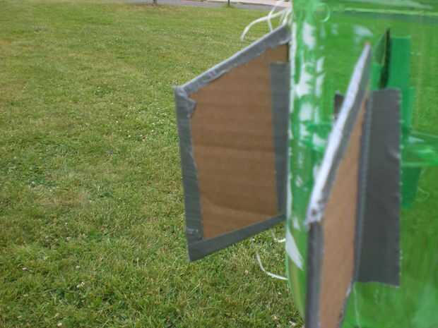 Una vez que se recortan las alas, con cinta adhesiva a los lados de la botella de la parte inferior de su cohete por lo que parece un poco a la imagen. Asegúrese de que están grabadas alrededor de la misma altura porque las alas efectúan la dirección y la altura del cohete.