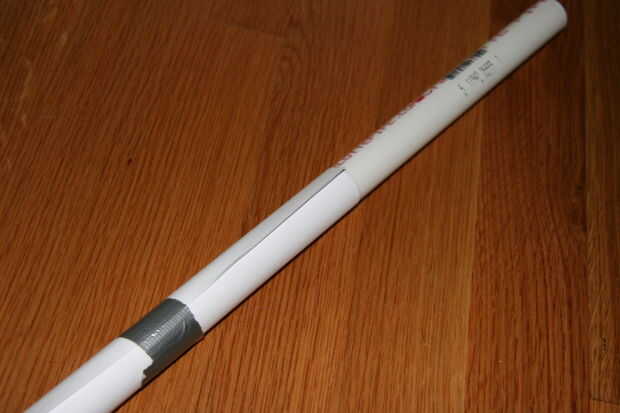 envolver el trozo de papel alrededor del tubo, cinta adhesiva y cubrir toda la pieza en 2-3 capas de cinta de papel. Deslice hacia el extremo del tubo y poner sobre 5 capas de cinta adhesiva sobre un lado
