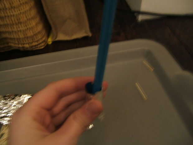 get the pencil entonces empújelo en el polvo de fósforo por lo que toca a luego gire la lámina alrededor del lápiz Finalmente Extraiga el lápiz el cohete es todavía hueco y todavía se puede ver el polvo de fósforo