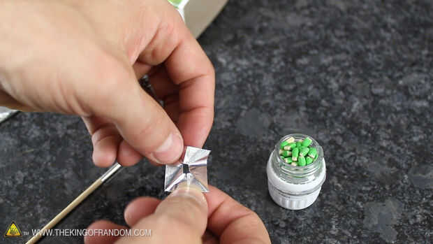 En este punto, coloque las aletas del cohete que formuló, despegando el material pegajoso en la parte posterior, a continuación, empuja el cuerpo del cohete a través del agujero en el centro.