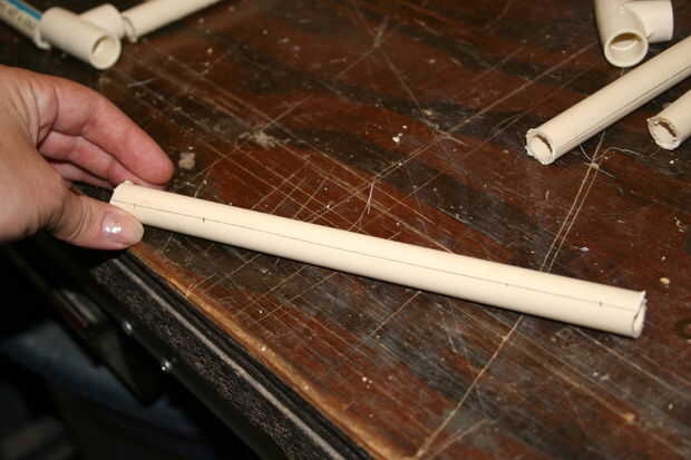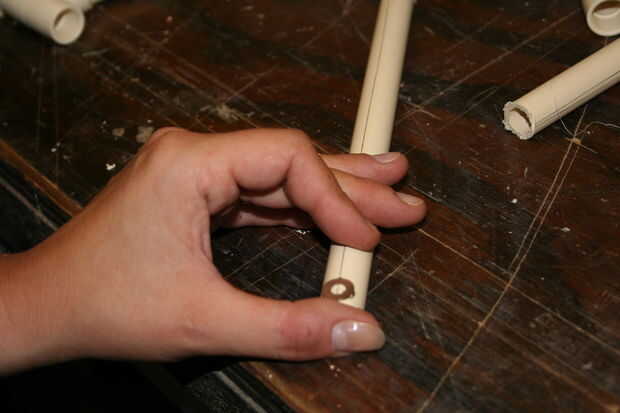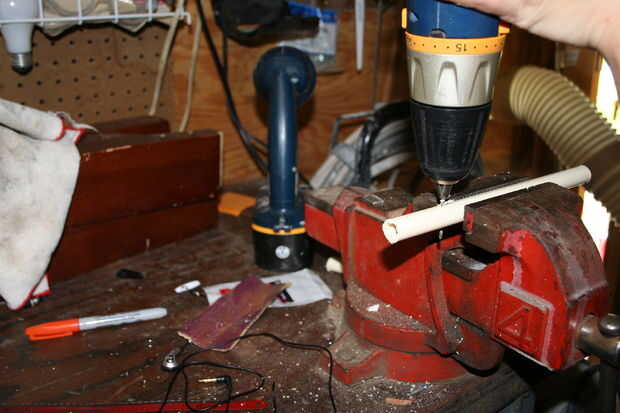 Taladrar el PVC donde tus marcas, van todo el camino en y luego por el otro lado. Esto es donde la visegrip viene muy bien, como puede estabilizar la PVC durante la perforación lo y tienen agujeros casi perfectamente alineados. (No es que esto es totalmente crítica, pero es bueno). Si no utilizas un visegrip, las abrazaderas de plástico con asas de goma funcionan OK con un pedazo de madera de desecho (las abrazaderas en c no agarre el PVC bien a menos que quieras el riesgo de machacar el PVC). Si no tienes acceso a cualquiera de los anteriores, he tenido éxito solamente utilizando una pieza de madera de desecho, muy cuidadosamente, sosteniendo el PVC a la madera y perforando hasta que golpeó la madera. Pero yo recomiendo un visegrip, ya que es mucho más fácil y más seguro!