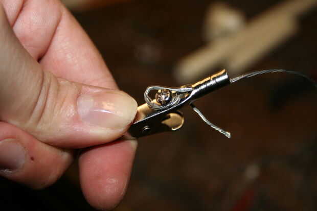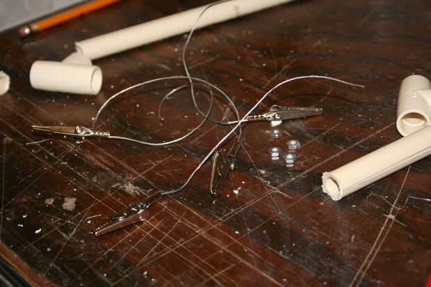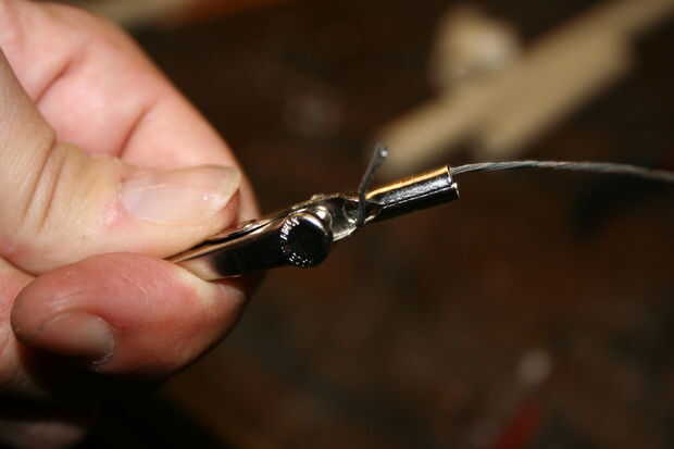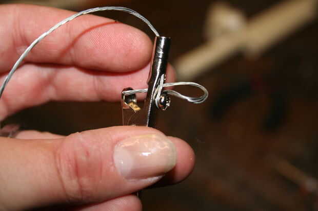 Los cocodrilos que compré tenían un canal poco conveniente en ellos y un tornillo de apriete hasta lo que se fijarán a ellos. Afloje el tornillo de la pinza, corte una generosa longitud de alambre de estructura Inserte en el canal (dejando una buena y larga cola fuera), a una toma de corriente y viento alrededor del tornillo. Tomar la longitud restante del alambre e inserte detrás detrás y jam nuevo en el canal para que no haga más adelante. Jale el extremo largo con sus alicates para apretar bien, luego apriete el tornillo de abajo. No los cuatro y luego ir a buscar algo de hielo para los dedos.