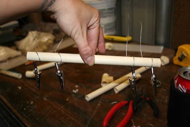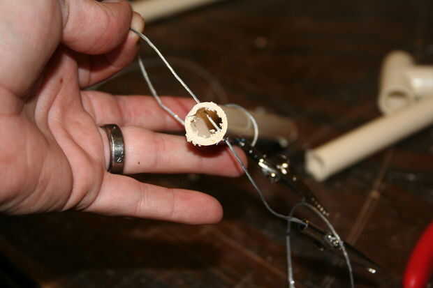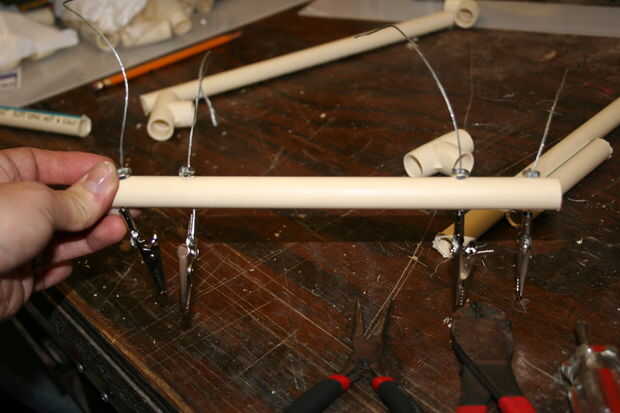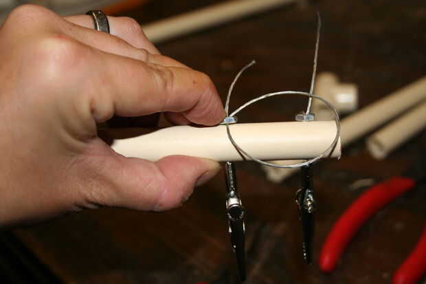 Una vez que están todos, coge una tuerca y pase el cable. Tomar el alambre y lazo a la tuerca, sosteniendo el nut flush para el PVC y la pinza cocodrilo apretada para no tener tanto cable extra entre el clip y el PVC. (Un poco pequeño es bueno, pero no mucho). Tensar el cable, recorte hacia abajo y romper los extremos para que no te pique.