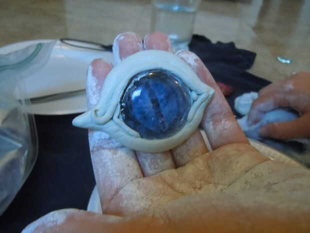 Por último, rodar una pequeña bola de arcilla que se ajuste entre el cabujón y los párpados en el ángulo interno. Este simple punto agrega mucho carácter a estos ojos!