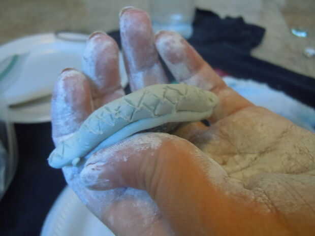 Este es un paso muy sencillo. Todo lo que necesitas hacer es utilizar un cuchillo para crear un patrón recurrente de triángulo en la arcilla. Este patrón no necesita ser más exactos, y no necesita ser tallado en la parte trasera de la botonera. Sólo crear el patrón en la parte frontal y a los lados de la botonera. También podría hacer diferentes formas, o variar las formas, si quieres.