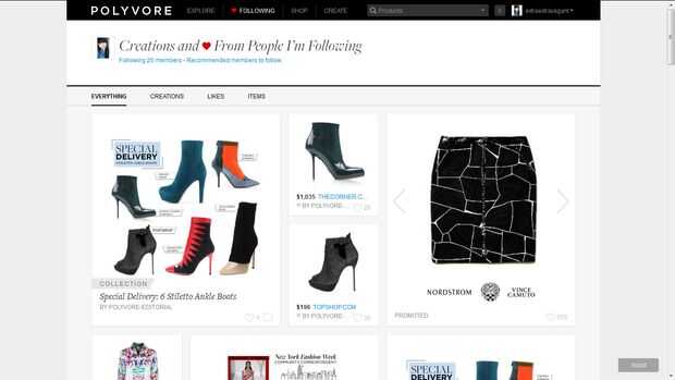 Una vez que tengas una cuenta, se trata de lo que parece la Página principal. Soy un usuario de Polyvore, y esta es mi página principal. Como se puede ver en la imagen de arriba, se compone de conjuntos creados por los usuarios que estoy "siguiendo". Cuando sigues a alguien, se actualizará su página principal con los sistemas que crean y post.