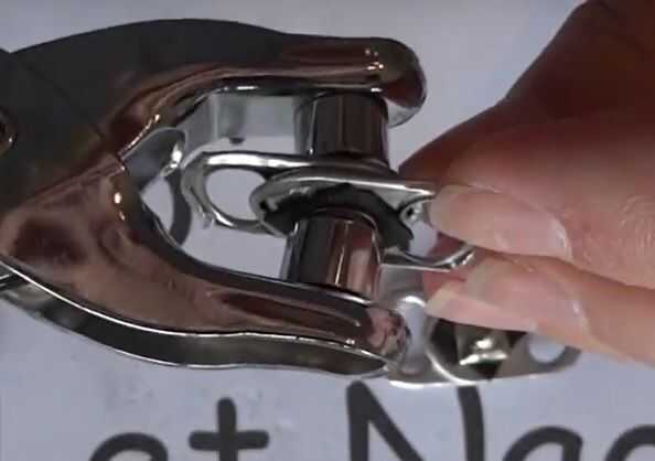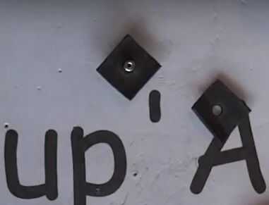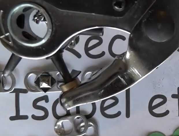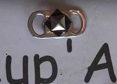 Use un perforador de cinta para cortar el tamaño del perno del remache en la Plaza del tubo interno. La parte inferior de la viga es la base, que Monte un cuadrado, 2 soda puede tabs, otra plaza y la segunda parte de la viga. Utilice los alicates de ojal para conectar todo.