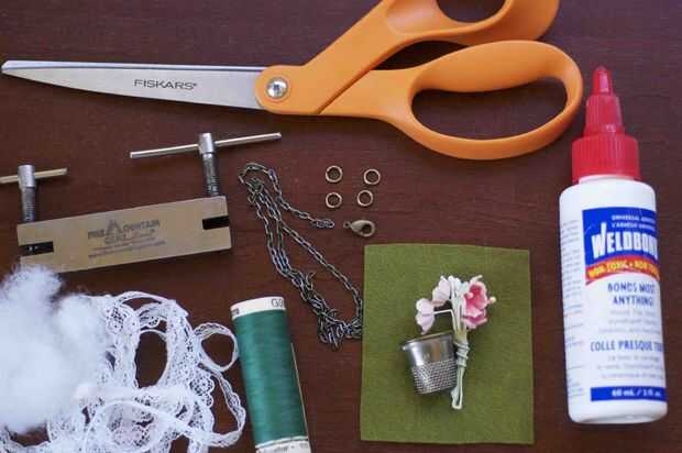 Aquí es lo que necesitarás: dedal, flor (uso uno pequeño o hacer uno con tela), pieza de fieltro, cadena o cinta, anillas, broche, hilo y aguja, relleno de poliéster, cordón, pegamento, alicates (no en la foto pero te necesita para abrir y cerrar los anillos de salto), una herramienta para hacer los agujeros en el dedal. Utilicé un gran sacador de agujero de acero de la montaña de fuego que uso para perforar agujeros en las monedas, pero también puede usar un taladro con una broca pequeña. Tenga cuidado si utiliza un taladro!