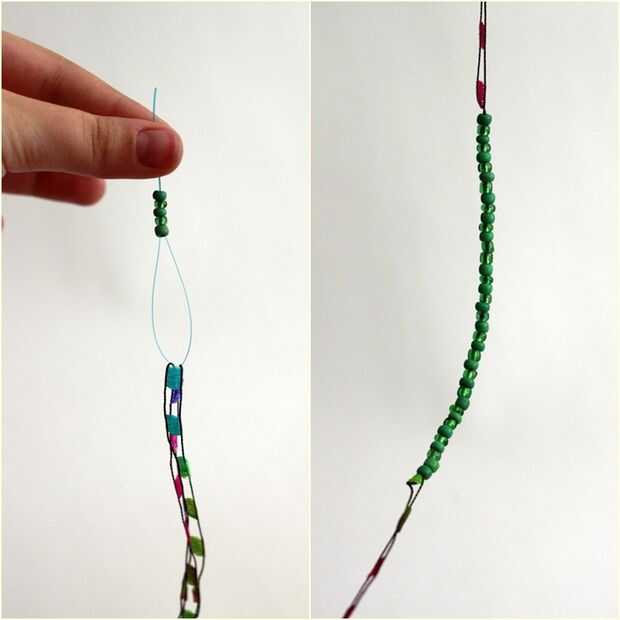 En primer lugar, usted necesitará poner un montón de abalorios en el hilo de ganchillo. Puede hacerlo mediante el uso de una herramienta de rebordear. Es básicamente gruesa seda en forma de una aguja gigante. Poner el hilo de ganchillo a través de la herramienta de rebordear, poner los granos en la parte final y luego tire de ellos hacia el hilo de ganchillo. Asegúrese de poner un montón de ellos allí.