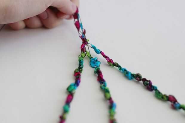Después de tener todos los tres hecho, atar en un nudo, justo antes de empezar a las diez primeras cadenas. Trenzar juntos hasta su alcance final de las diez cadenas y atar otro nudo.