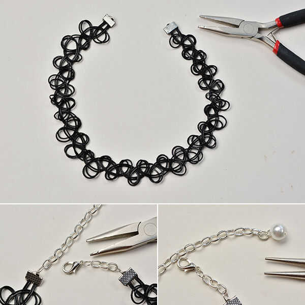 3ª, combinan un 8 mm blanco ronda grano de la perla con la cadena de plata izquierda. Conecte los dos extremos de la gargantilla elástica del tatuaje.