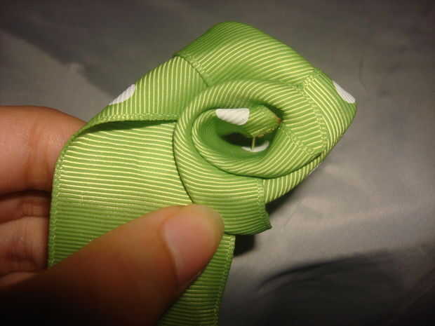 gire la punta. Ahora se puede ver hay un pequeño pliegue en su cinta. Tome la parte inferior, gire y gire alrededor de su punta rosa.