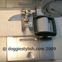 Pase la cinta a través de la cerradura de la diapositiva, dejando aproximadamente un trozo de cinta para coser juntos dos pulgadas. Coser dos costuras, arriba y abajo, a través de la cinta. Estas costuras puntada triple usando el botón de reverso en su máquina de coser.