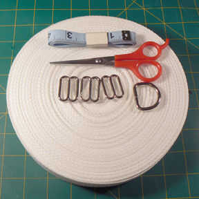 Las herramientas y suministros necesarios para este proyecto son bastante simples. Usted necesitará algunas correas de 1 pulgada, un par de tijeras, una cinta métrica, un anillo en D, tres deslizadores y una máquina de coser.