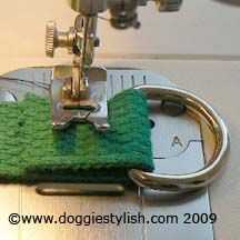 Tomar uno de los anillos en D, inserte la cinta a través de él y doble 3/4 de pulgada. Coser una costura recta, hacia arriba y hacia abajo sobre la cinta. Esta línea de fuerza, utilizando el botón atrás de su máquina de coser puntada triple.
