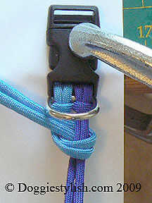 Para hacer el nudo de sube y baja, nos va anudando alternando nudos half hitch. Tomar el primer color de cuerdas, trae detrás el segundo conjunto de cables y a través del bucle que acaba de crear. Suavemente apriete el nudo. No apriete demasiado o tu trabajo de nudo comenzará a girar.