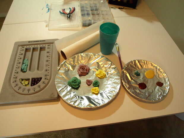 Puedes ver tengo mi cuentas de coordinación elegidos (esto me ayuda a decidir qué colores y cuánto, "antigüedades" quieren), mi vaso para diluir mi pintura agua y enjuague mi cepillo en, mi paleta de pintura con lentamente de mis colores "antigüedades" en él, otro papel de aluminio envuelto placa para configurar mis rosas mojados a seco y mis toallas de papel para eliminar el exceso de pintura.